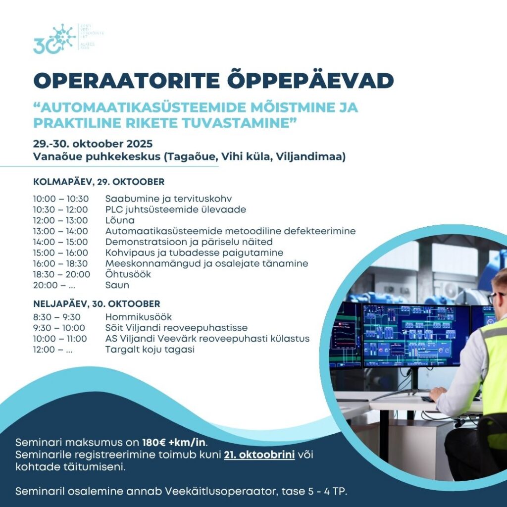 Kutsume EVELi liikmeskonna vee- ja reoveepuhastusjaamade operaatoreid osalema operaatorite õppepäevadel, mis toimuvad 29.-30. oktoobril 2025 Vanaõue puhkekeskuses Põhja-Sakala vallas Viljandimaal. Täpse asukoha leiad SIIT.